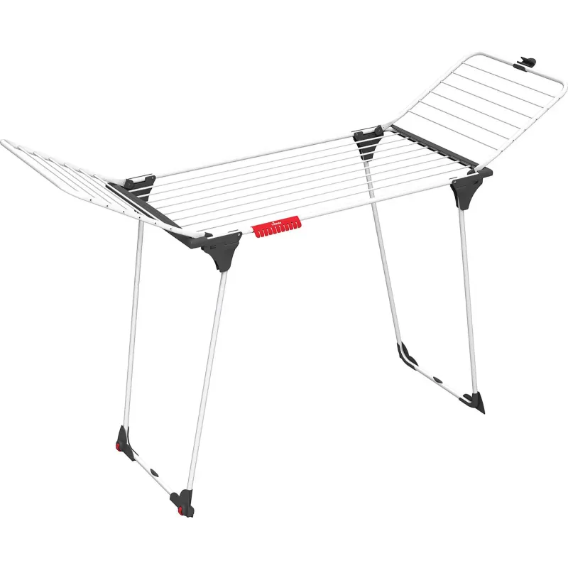 Vileda Homedry-King tørrestativ, 20 m tørreplads Hvidt tørrestativ med U fødder og vinger, der har et meget sikkert og stabilt design af aluminium og stål. Stativet har plast afslutninger ved vinger og fødder samt ekstra tykke tørre aluminiumsstænger